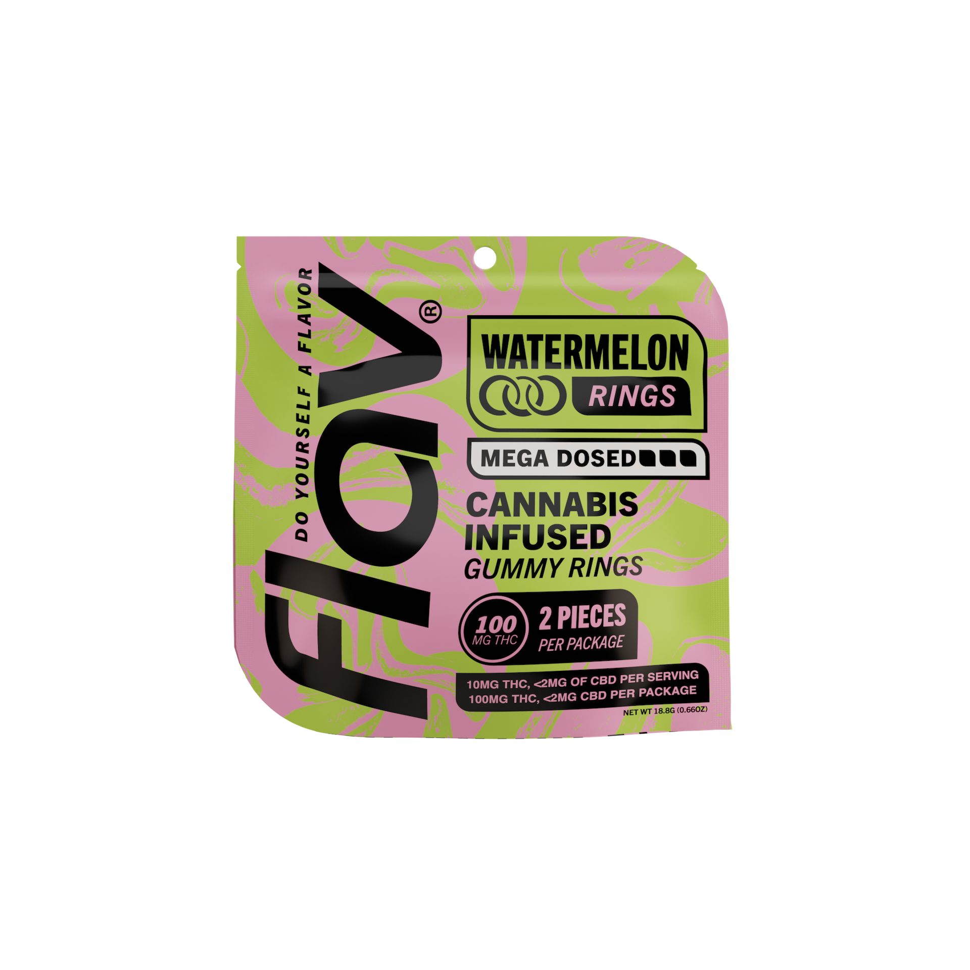 Enhance your day with Flav cannabis-infused gummy rings. Available in seven sweet flavors, Flav gummy rings provide an excellent adult snacking experience. With only the finest ingredients, our fruit flavored THC gummy rings are gluten free and provide controlled dosing with a fresh, delicious taste. These come in a 2 pack. (50)mg a piece