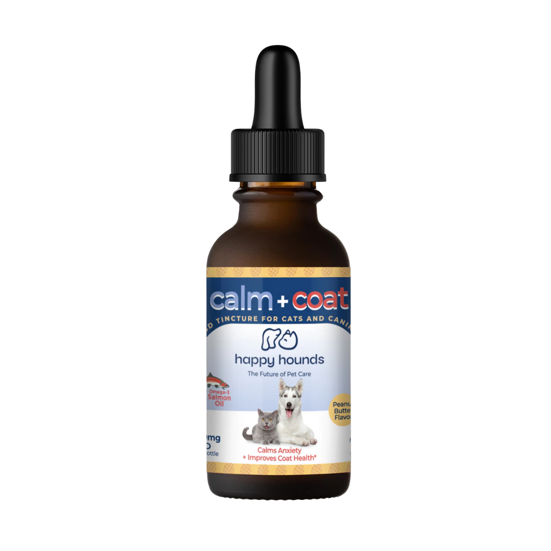 Happy Hounds Calm + Coat Drops are the best calming drops for dogs designed to soothe stress, reduce anxiety, and improve skin & coat health. Made for both dogs and cats, with Salmon Oil, Turmeric, and full-spectrum hemp to provide natural stress-relief and help to hydrate your pet's skin and coats from the inside out.