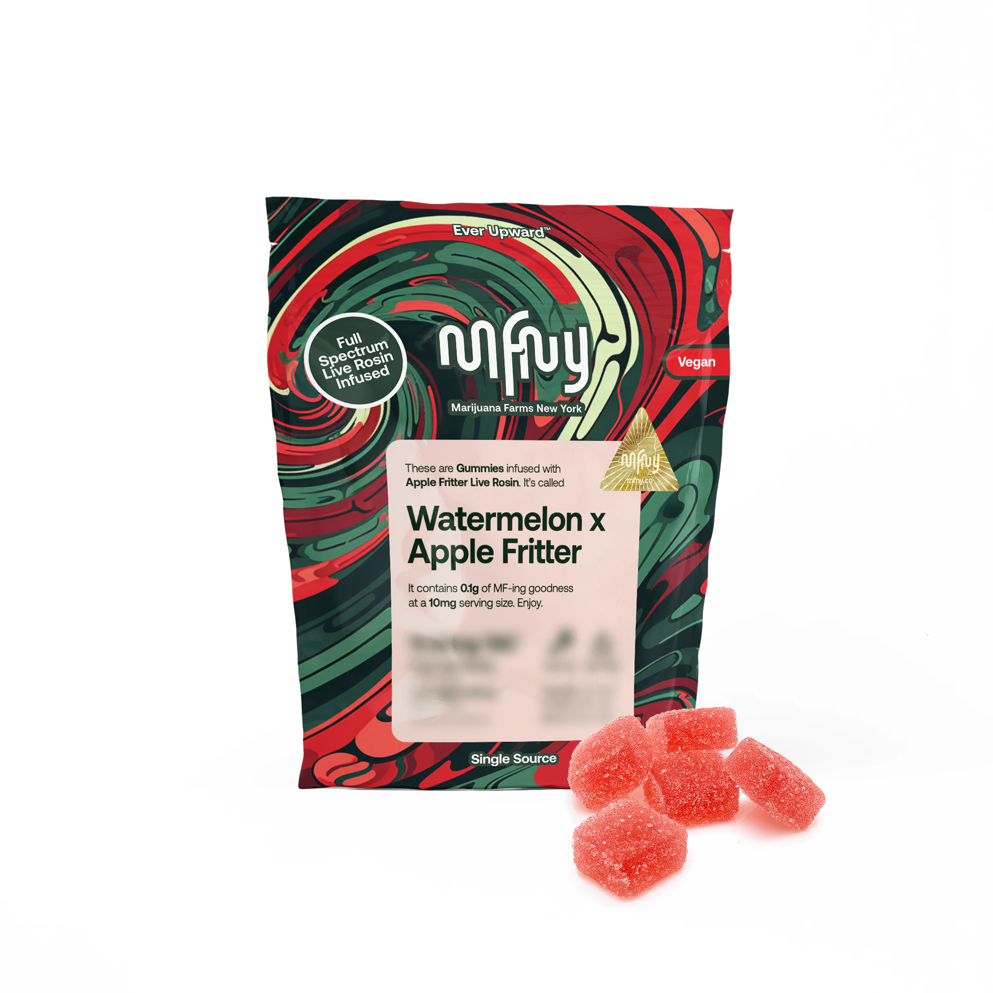 These mouth-watering Watermelon Fritter gummies are unlike any other edibles you've tried. Our vegan, full-spectrum gummies are infused with MFNY’s premium Apple Fritter live rosin extract. Unlike distillate, live rosin is made via solventless extraction from premium fresh frozen plants, preserving all the natural terpenes and tantalizing earthy flavors of the Apple Fritter strain, paired with the natural flavor of watermelon. Ingredients: Organic tapioca syrup, organic cane sugar, water, pectin, natural watermelon flavor, brilliant pink color, citric acid, sodium citrate.