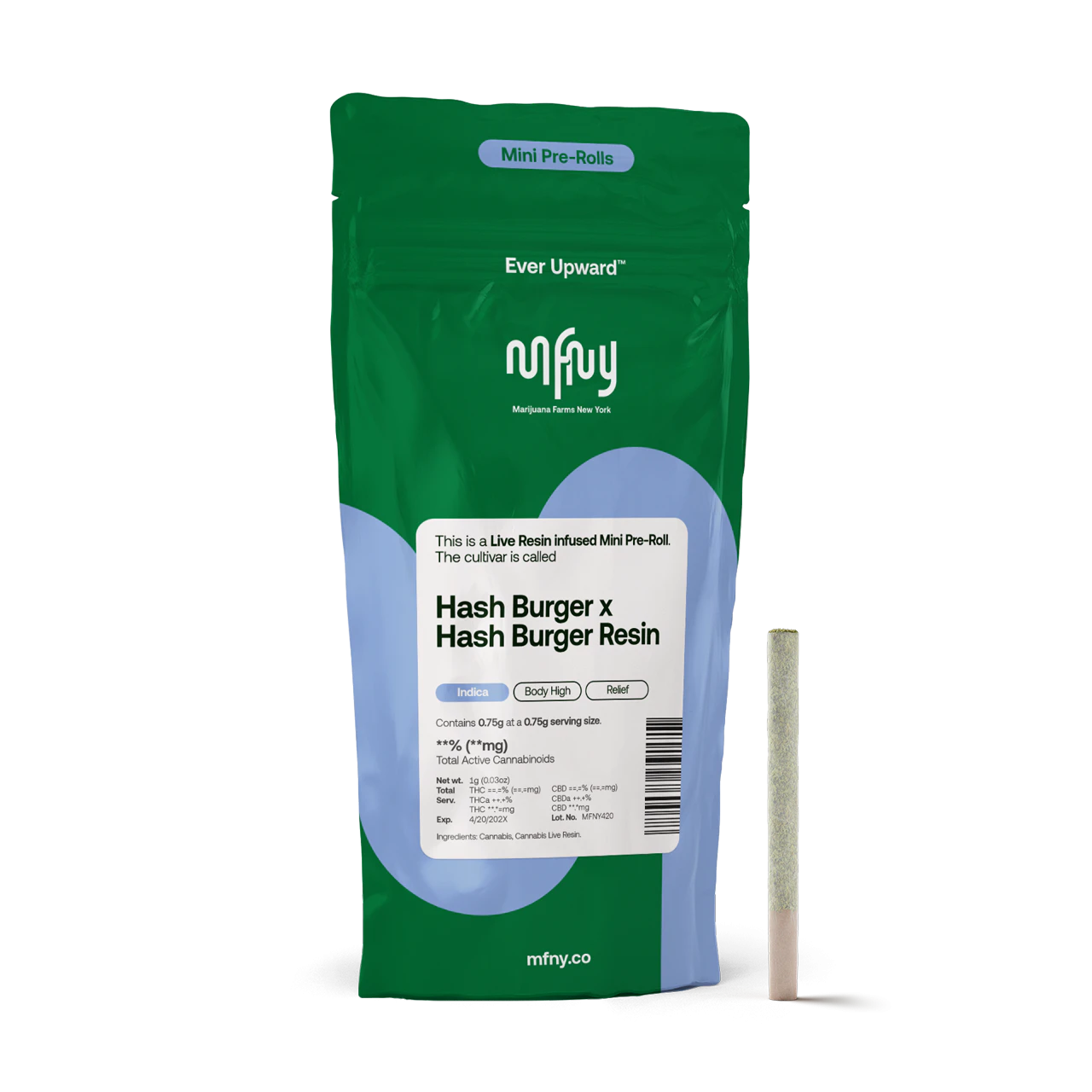 For our resin infused pre-rolls, we start with premium, hand-trimmed whole Hash Burger flower then infuse it with our in-house made Hash Burger live resin HTFSE (High Terpene Full Spectrum Extract from fresh frozen buds). This process creates a higher potency, flavorful product, with a sweet yet spicy and lemony body; finished off by notes of woody pine and fresh flowers from the Hash Burger cultivar. Potent and high in THC this product is a treat for experienced cannabis consumer. No shake, no trim. Just the very best of our craft cannabis, ready to enjoy. Exclusively single-sourced at MFNY in the Hudson Valley.