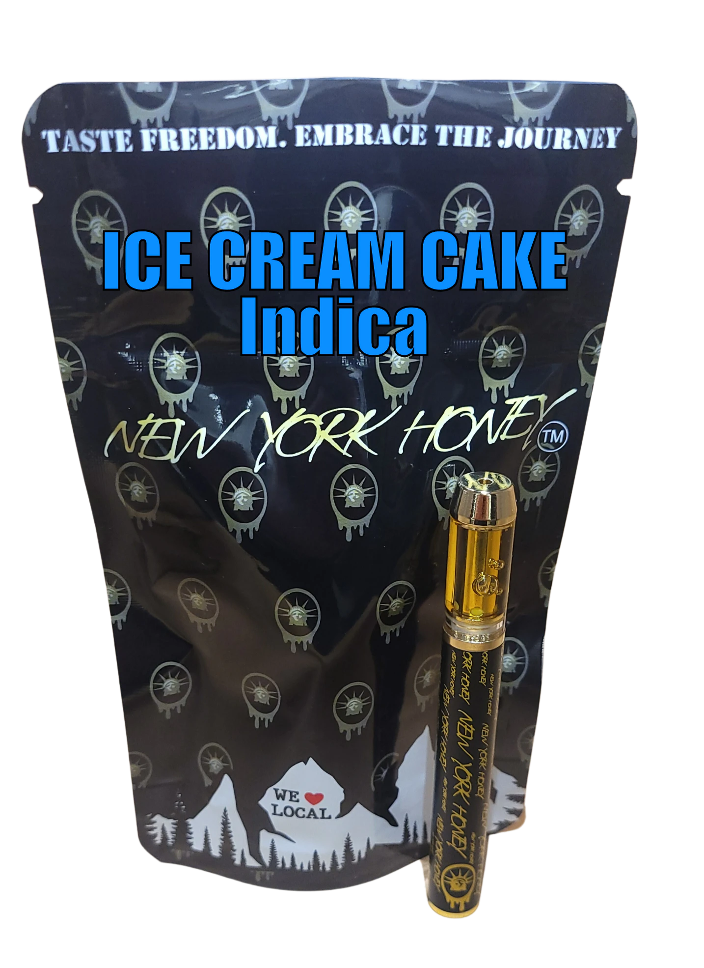 Ice Cream Cake is an indica marijuana strain made by crossing Wedding Cake with Gelato #33. This strain offers sedating effects that leave your mind and body completely relaxed. Ice Cream Cake features a creamy flavor profile with sweet hints of vanilla and sugary dough. Welcome to the NY Honey Vape Experience! Did you know? Your NY Honey Vape is not just any vape - it's a hand-crafted and custom-blended piece of art, designed for maximum effect and enjoyment. Plus, it's eco-friendly! While sold as disposable, your NY Honey Vape cartridge is actually RECHARGEABLE and REUSABLE. To recharge, simply: Locate the NY Honey drip logo on the bottom of your cartridge. Unscrew the logo to reveal a hidden charging port. Having trouble? Don't fret! Please feel free to reach us directly at NYHoney@veteranschoicecreations.com with any issues concerning the function of your cartridge. We're here to help! And here's a sweet secret: Your NY Honey Vape cartridge is also REFILLABLE. You heard it right! We're excited to announce that in the near future, we'll be releasing a refill tube. So, hold on to your hardware to enjoy our top-quality product even longer and do your part to minimize waste.
