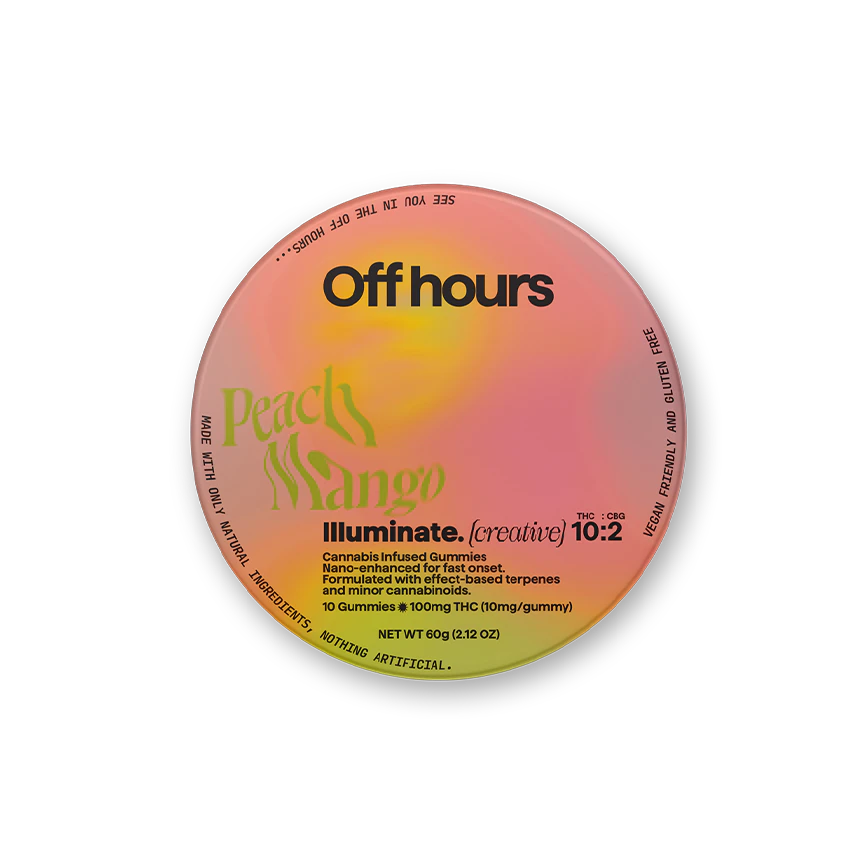 Off Hours Peach Mango gummies are nano enhanced, making them fast acting. They each have 10mg THC with 1mg of CBG. This gummy influences illuminating creativity. Ingredients: ORGANIC CANE SUGAR, REVERSE OSMOSIS WATER, ORGANIC TAPIOCA SYRUP, ORGANIC FRUIT JUICE FROM CONCENTRATE, FRUIT PECTIN, ORGANIC FRUIT FLAVORING, NATURAL FOOD COLORING, MCT OIL, CANNABIS EXTRACT, SOY EXTRACT, TERPENES
