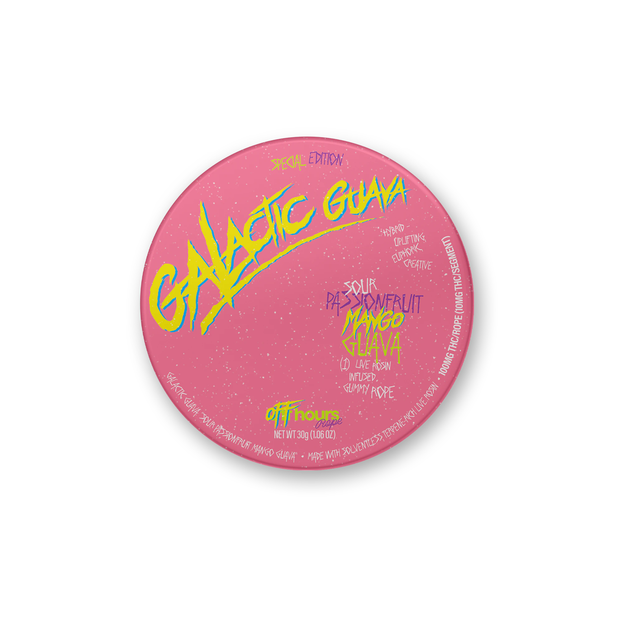 BLAST OFF with Off hours “GALACTIC GUAVA” live rosin gummies. A tangy mix of sour passionfruit, mango, and guava delivers tropical sweetness with an uplifting euphoric high that sparks creativity and color.