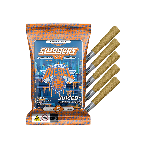 Sluggers JUICED* 5-Packs come Triple-Infused with Premium Flower, Solventless Hash, Diamonds, High Terpene Extract, and rolled in kief. Each pack comes with 5 hard hitting JUICED prerolls and an exclusive collectible card, sealed in an air tight, rainbow holographic tin and mylar for long lasting freshness and quality.