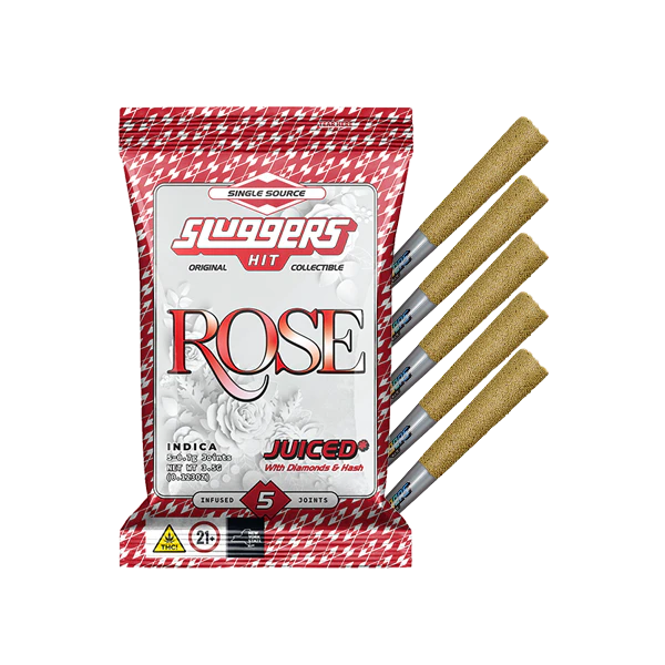 Sluggers JUICED* 5-Packs come Triple-Infused with Premium Flower, Solventless Hash, Diamonds, High Terpene Extract, and rolled in kief. Each pack comes with 5 hard hitting JUICED prerolls and an exclusive collectible card, sealed in an air tight, rainbow holographic tin and mylar for long lasting freshness and quality.