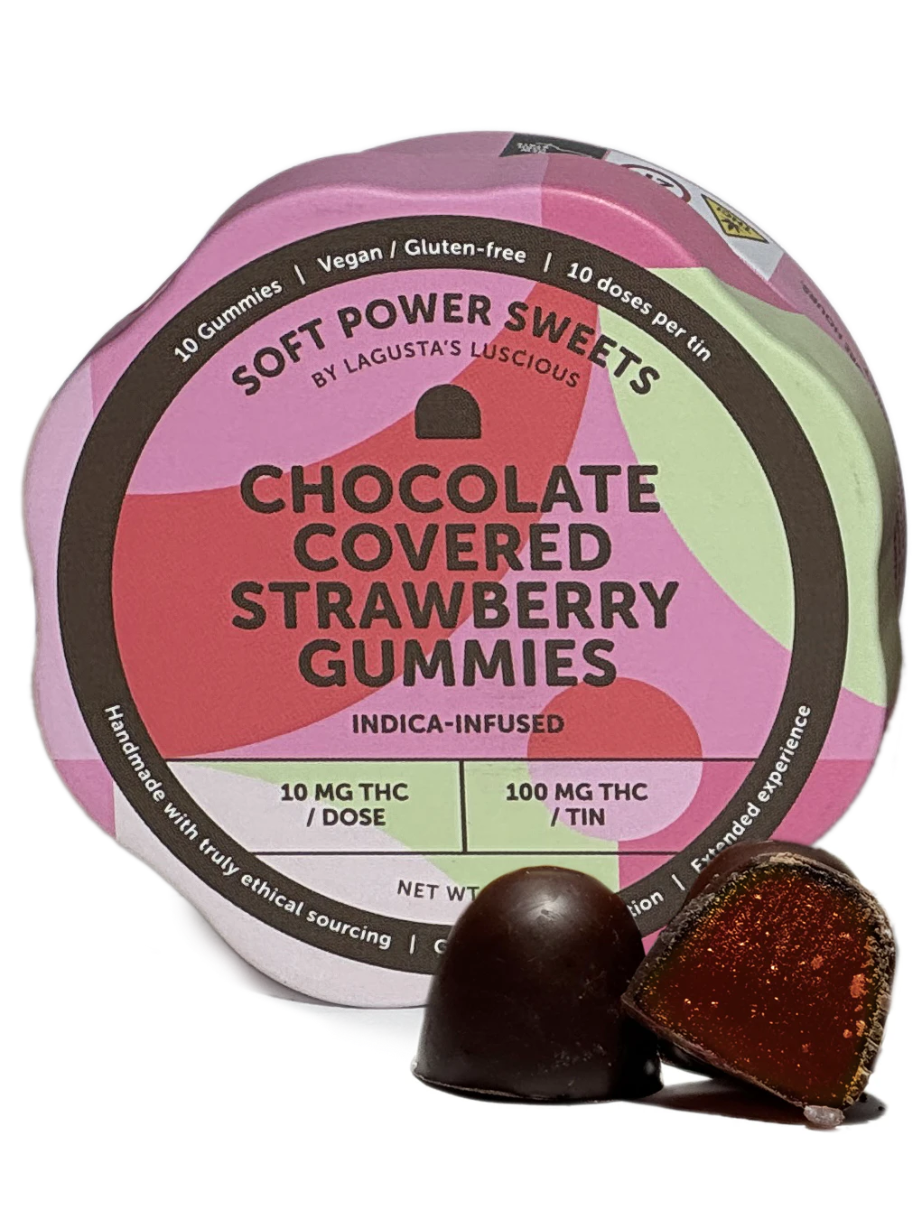 Soft Power Sweets Chocolate Covered Strawberry Gummy. Our vegan indica-leaning gummy is made in a classic French style with loads of fresh fruit. This results in an extra juicy gummy that contrasts perfectly with a thin coat of semisweet chocolate. This pairing enables the lipids in the chocolate to bind with the cannabis - doubling its bioavailability and significantly lengthening the experience. 10mg per piece/100mg per tin. ethically sourced/vegan/gluten free